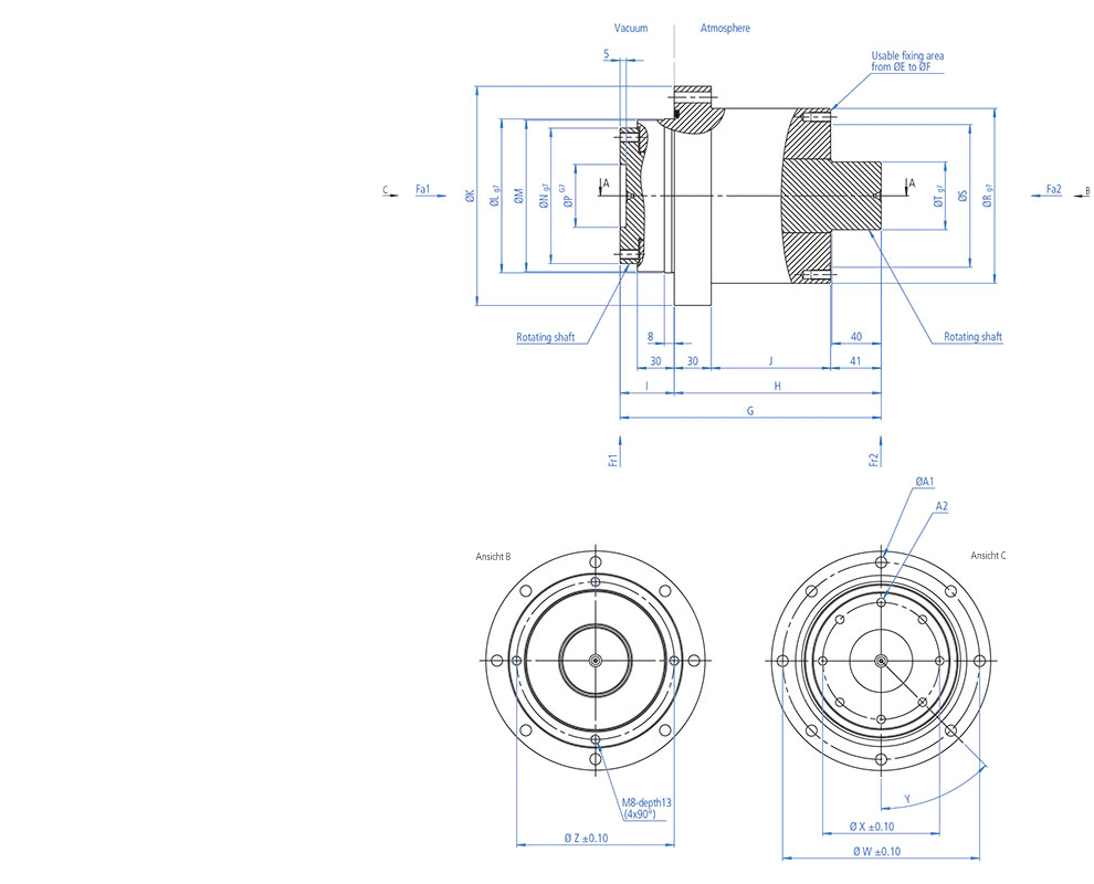 These rotary feedthroughs are ideal for applications involving high axial loads combined with low rotational speeds and high output torques. The figures given are approximate values, which can change if one of the other parameters varies. In this case, we will recalculate these figures according to your specification.