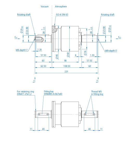 This rotary feedthrough with an ISO-K flange has been designed for high output torques. Moreover, it is suitable for high radial loads. The shaft is connected using parallel keys.
