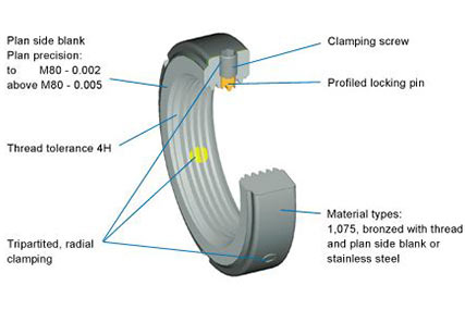 ALMA shaft nuts for radial clamping are basically fabricated with a three part clamping. In this system, 30 % higher clamping force of the installation can be reached as compared to dual clamping.